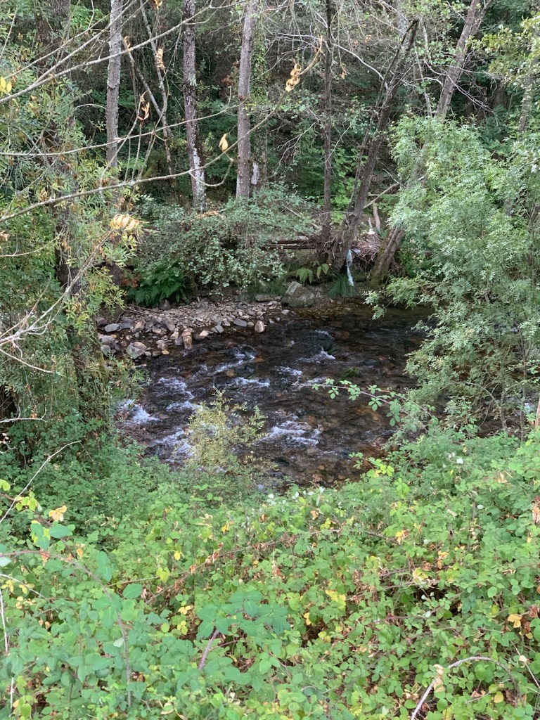 We continued to wind through the Valcarce Río valley, sharing our paved walkway with the winding national highway and the occasional overpasses of the A6 autovia. We seldom were distracted by road traffic because there was little of it. We also got an occasional glimpse of the Valcarce Río, among the thick green trees and undergrowth below us on the left.
