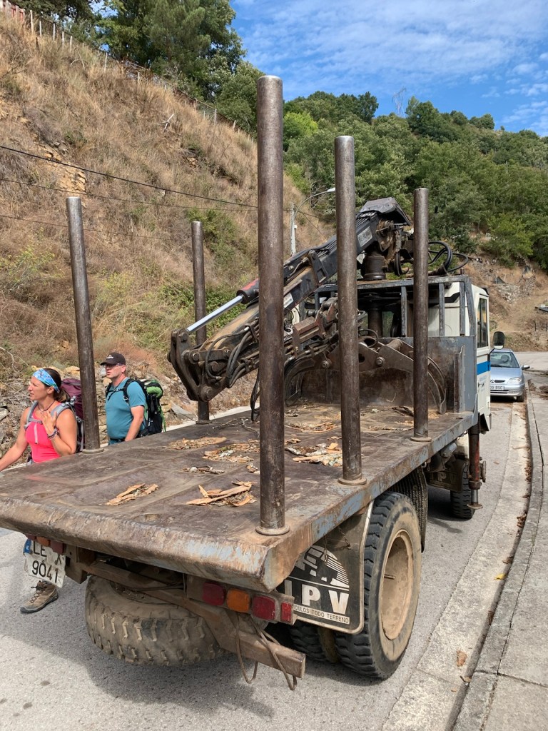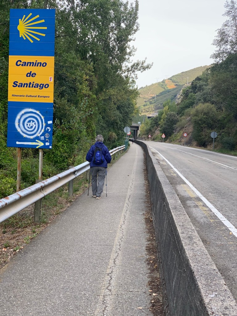 We stopped for breakfast at a huge truck stop and hotel complex, took off our rain gear as blue skies appeared, then walked through Portela de Valcarce (pop. 37).