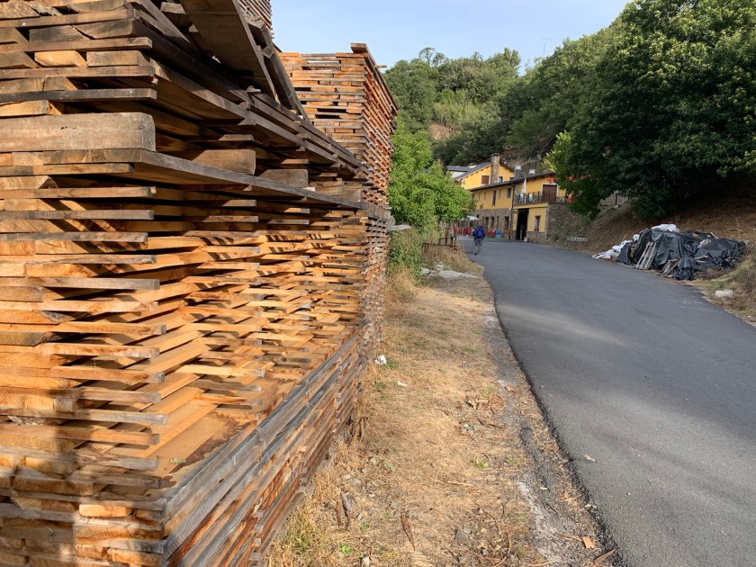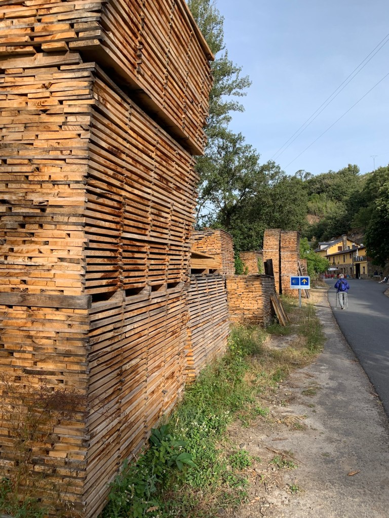 We left the main road and began walking on a paved surface into Trabadelo passing several stacks of aging logs and more cut lumber either aging or awaiting pickup for places unknown and finally we walked by the lumber mill.