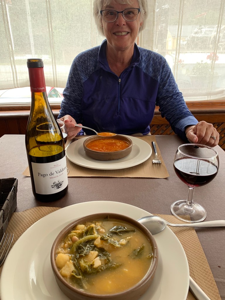 We had our meal for the day at lunch. It was delicious. First course was gazpacho for Jim and Lacón con Pimientos for Linda.