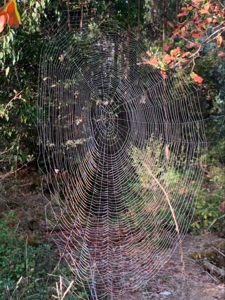 First time we’ve ever seen something inside a Hórreo… and this one is being loaded up with corn for the winter.Another first, for us: yellow and white hydrangeas along a wall of a nice home.We both dislike spiders but like to photograph spider webs! Jim spotted this one just before leaving the forest,walking out of the forest and onto the path leading into O Pedrouzo… pilgrim tour bus in the background.Just as we were walking into O Pedrouzo , we observed a bunch of “pilgrims” who just got off a bus associated with Regency Cruises called, laughingly, “Following the old James road”!Walking into O Pedrouzo… tour bus just dropped off pilgrims and waiting to pick them up further down the Camino. At this point pilgrims are only 12 miles from Santiago.