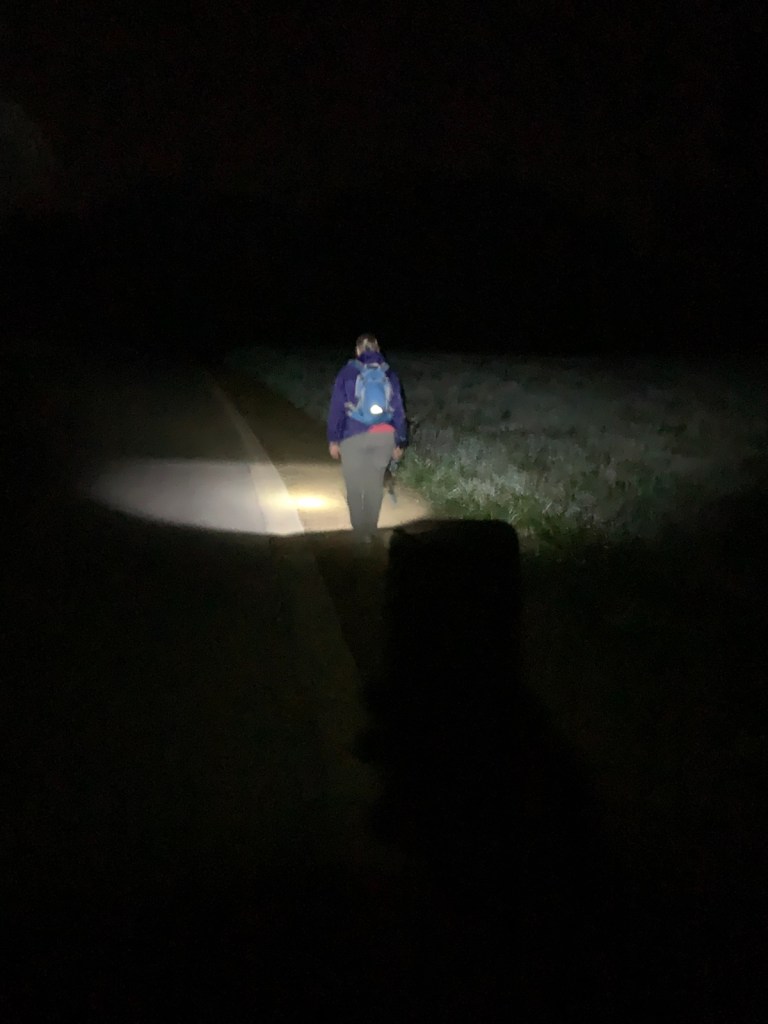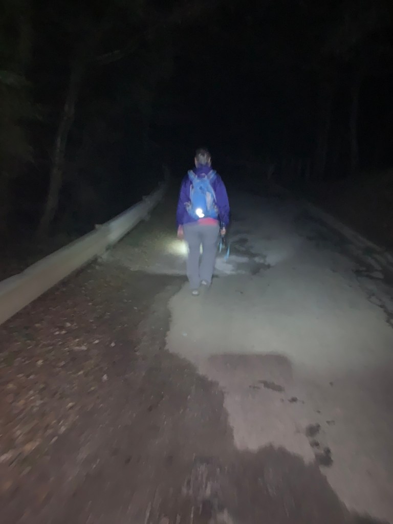 It was dark when we started at 7:55. We walked uphill continuously, for the first mile, but were surprised because we didn’t need to stop for a breather along the entire stretch. The incline was just enough for a workout, but not enough to get us winded.