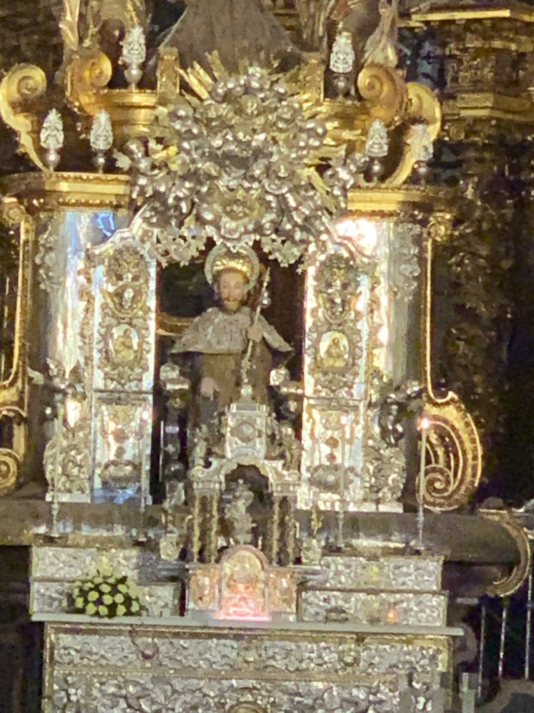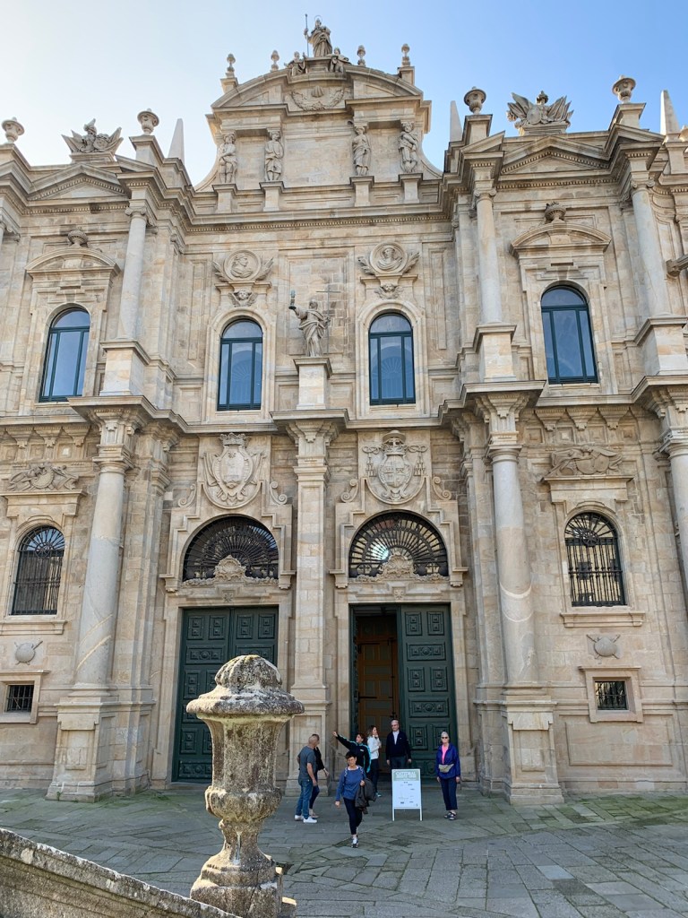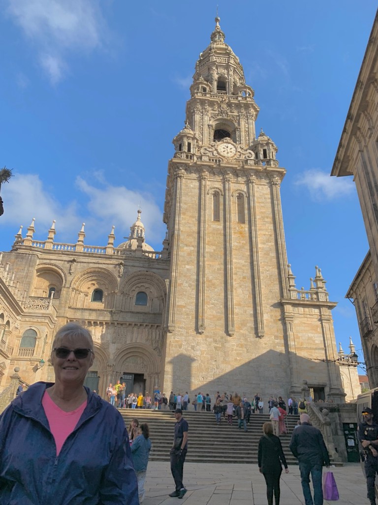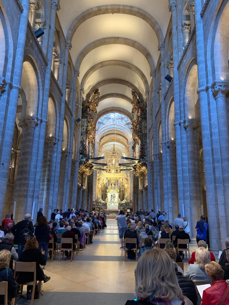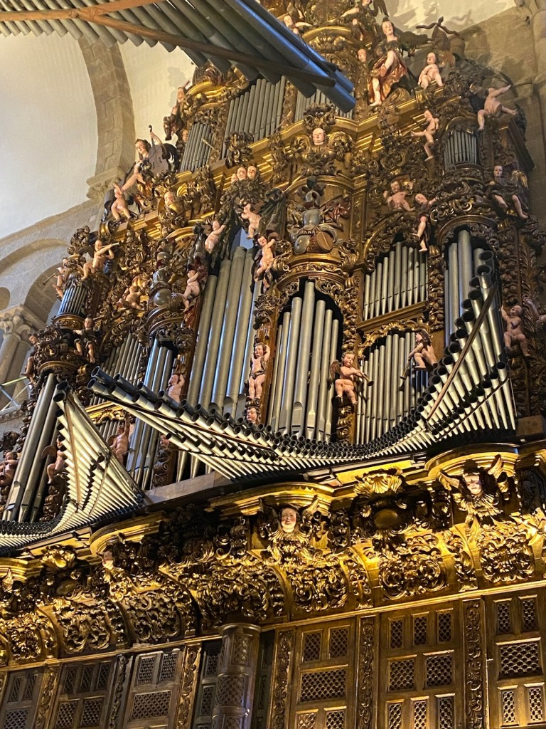 That’s us in the Obradorio Praza with you know what behind us.The Platerias (silversmiths) facade and the Tower of the Clock (east door)North DoorObradorio facade and Portico of Glorythe line for access to the Crypt of St Jamesthe altar from the back of cathedral A Cathedral service kept us from getting any closer to the altar… zoom in to see three versions of St James: Santiago Matamoros (Moor-Slayer), Santiago Peregrino and Santiago Apóstol.The cathedral was started in 1075 and finished in 1211 in a Romanesque style. Baroque adornments were added to the altar in the 1700’s along with other both interior and exterior additions. half of the magnificent organSantiago Apóstol (a little fuzzy with iPhone11 9x zoom)