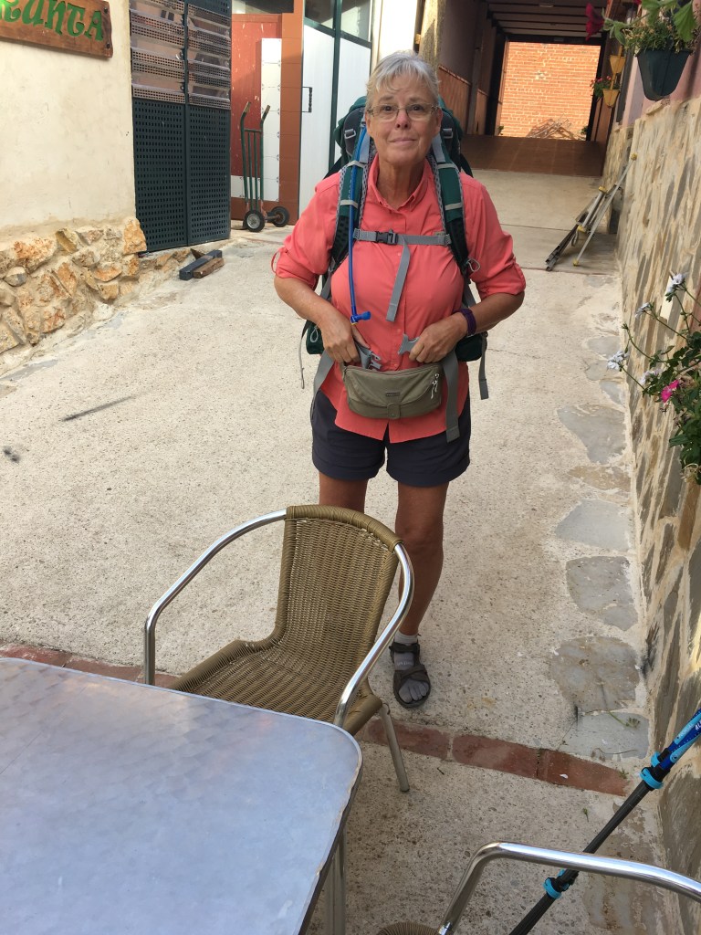 Linda buckling up after our OJ break in St Nicolas de Camino Real