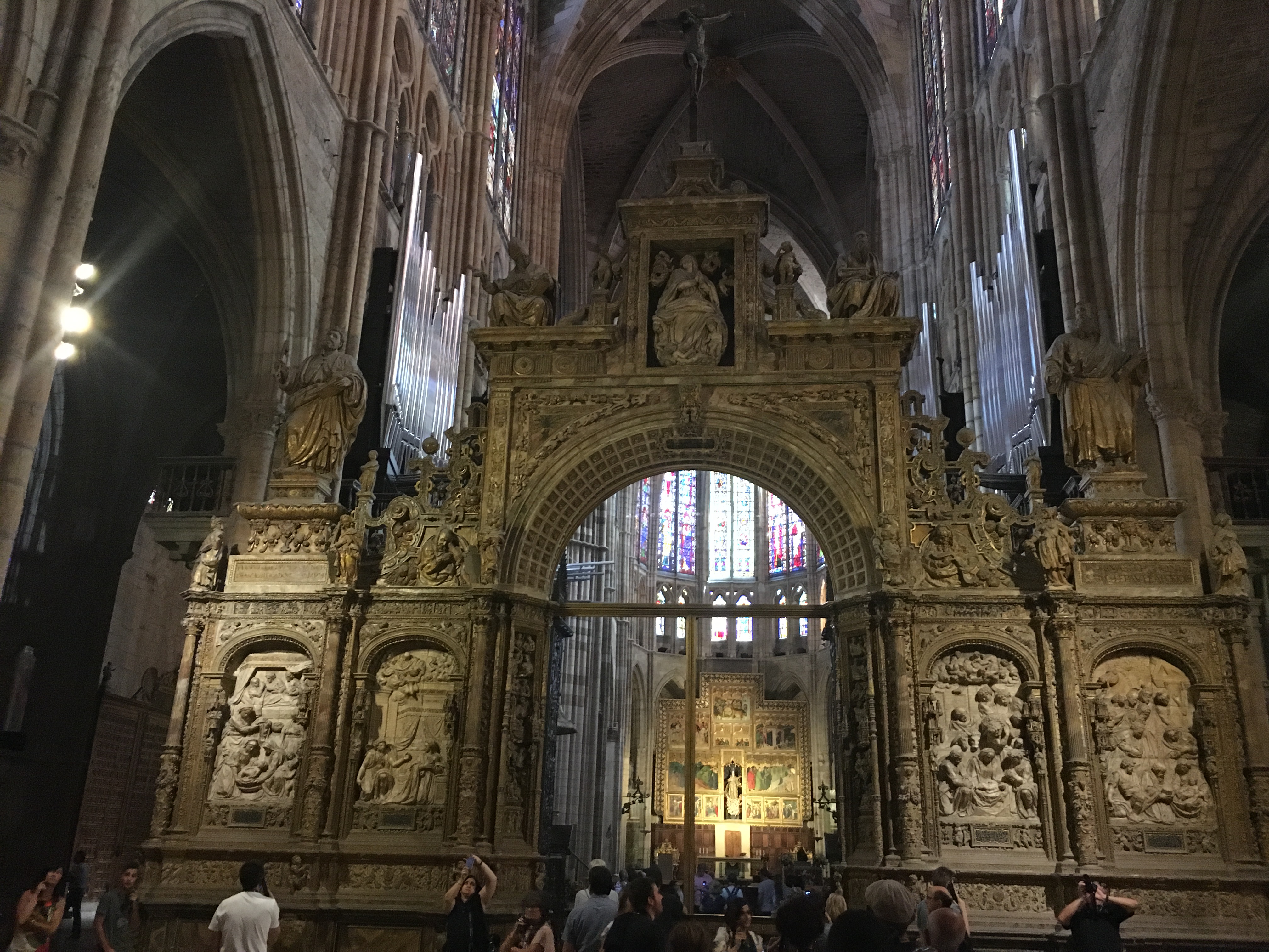 Previous Image Next Image IMG_0762 Beautiful carvings and sculpture at front of Catedral, organ and choir with wood carved seating area directly behind this