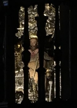 Previous Image Next Image IMG_2367 Here you can see through the bars (sorry, as close as I could get) a pilgrim with hands on St James ( Santiago) shoulders, giving him a hug. Hundreds line up each day to walk up a staircase behind the altar to access gold statue of Santiago.