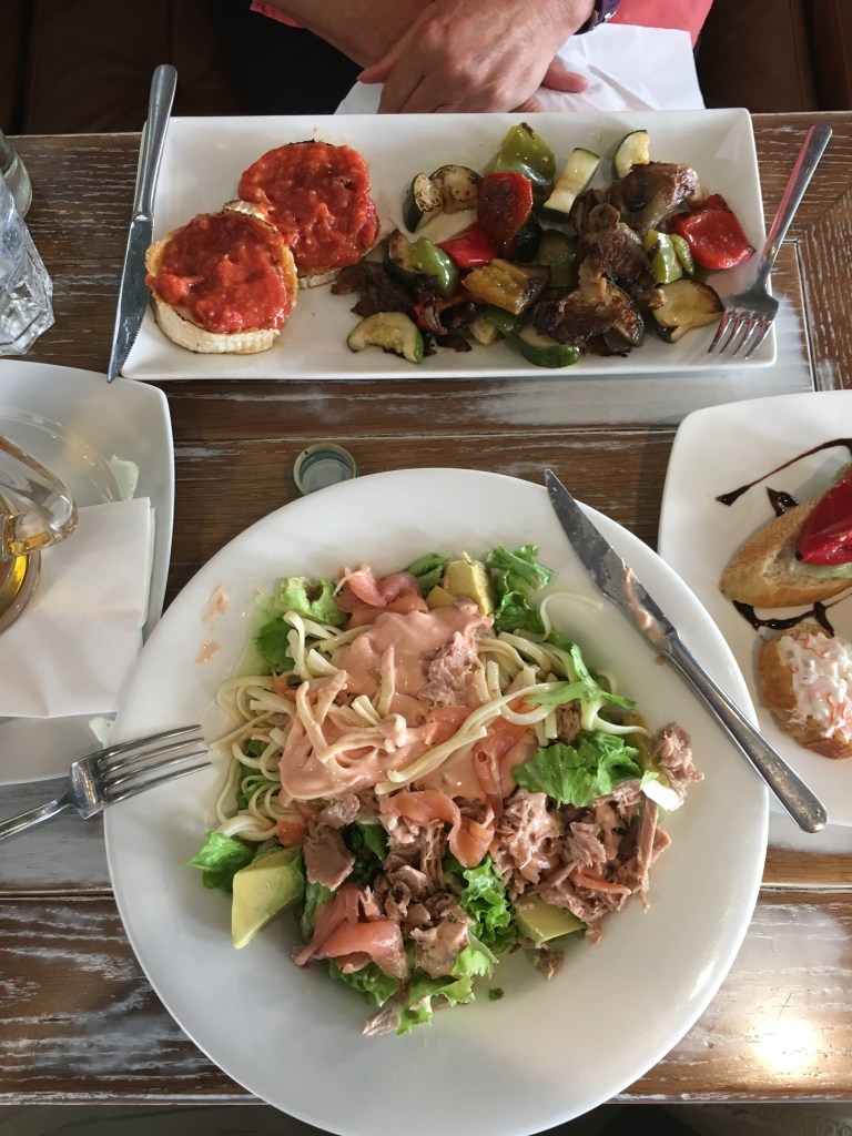 Previous Image Next Image IMG_2398 Puréed tomatoes on goat cheese and roasted vegetables for Linda, Norwegian salad for Jim