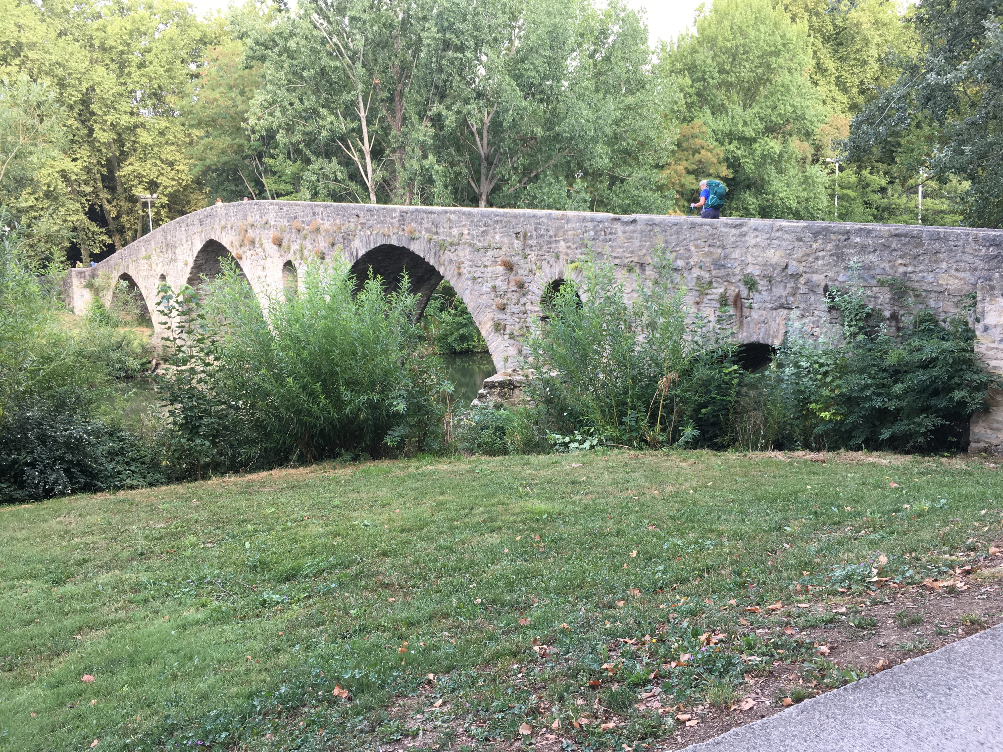 Linda crossing over Rio Arre on the medieval Magdalena Bridge