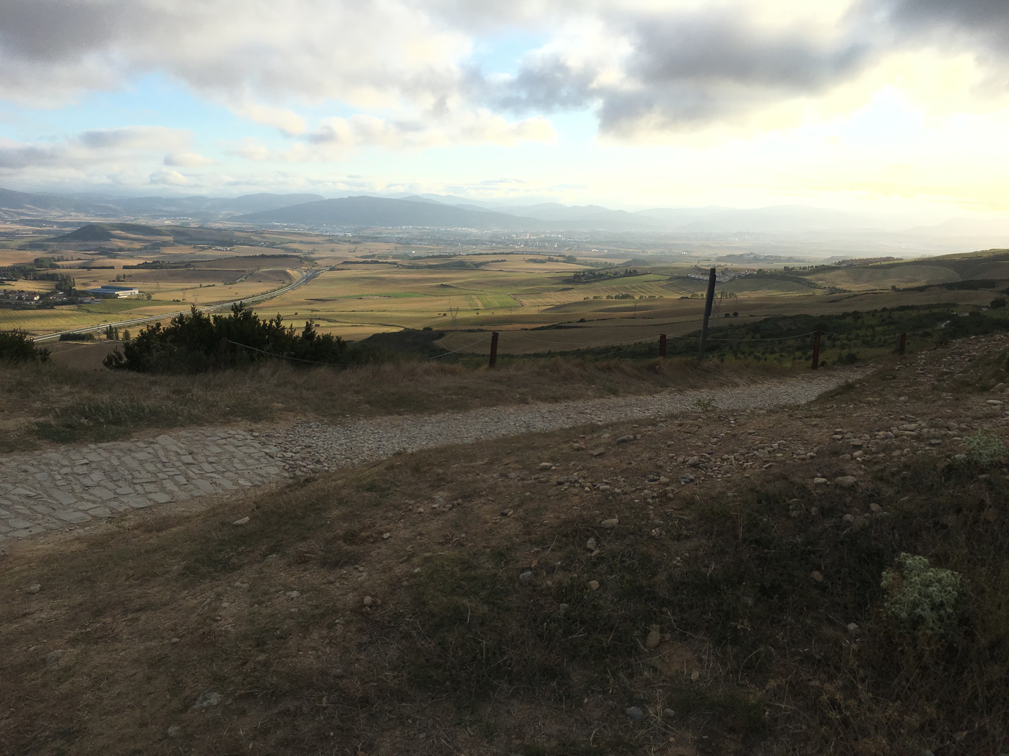 Looking back at Pamplona & Pyrenees from Alto de Perdon