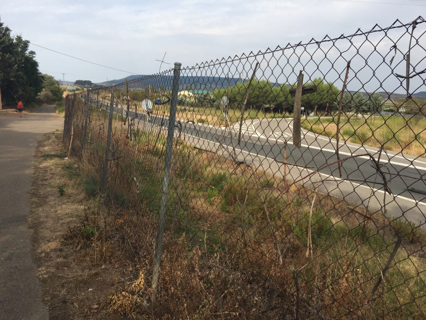 Previous Image Next Image IMG_9055 This section of chain-link fence along the highway presented pilgrim artists a chance to make crosses with pieces of wood, etc.