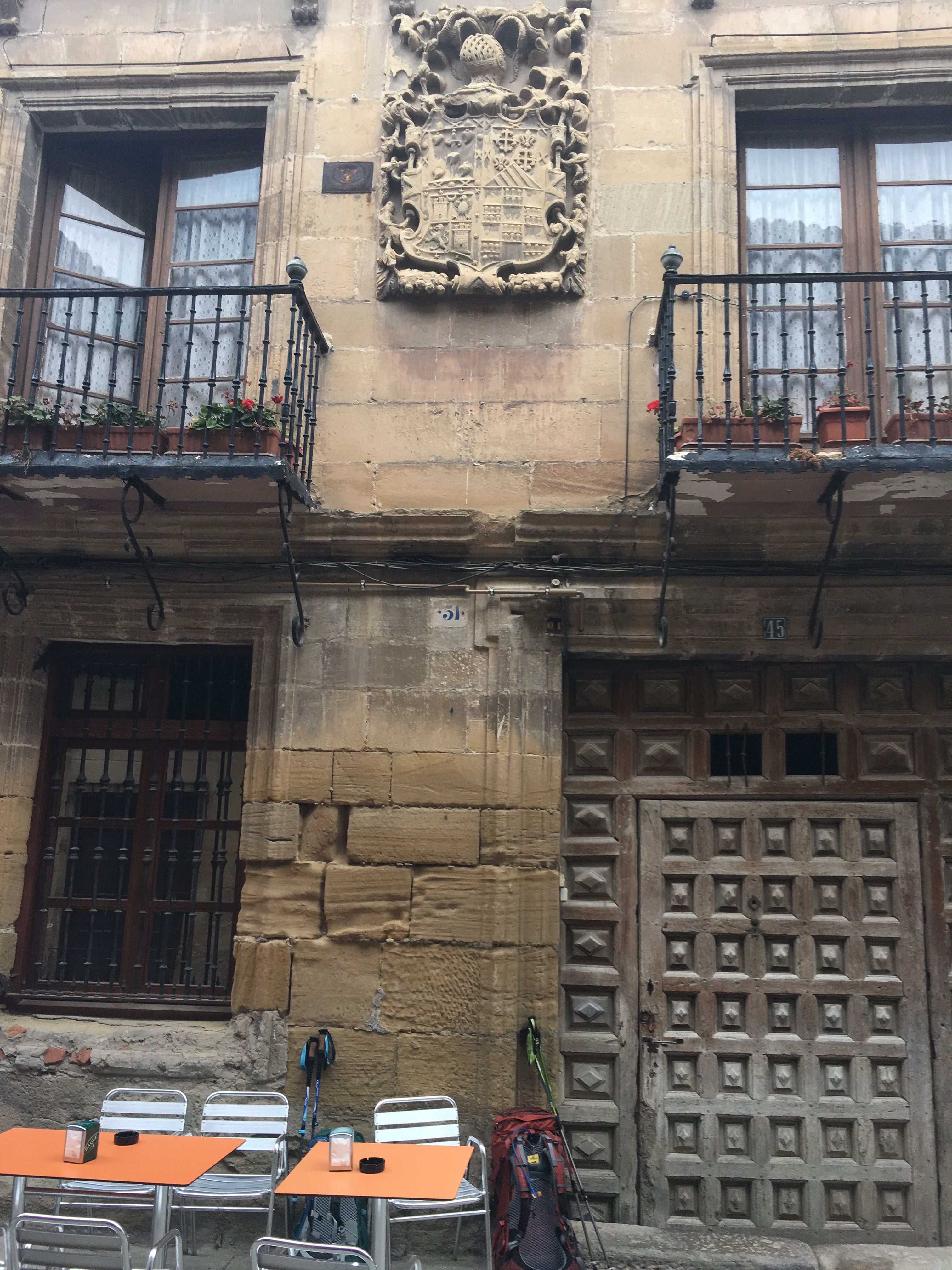 Previous Image Next Image IMG_9609 Family crest on wealthy family home near Catedral that also served as apothecary for past two centuries. That’s our breakfast table with backpacks on ground